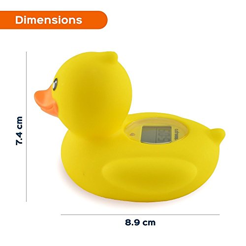 4-in-1 Design: Floating thermometer, clock, timer and baby bath toy. Measuring water temperature in the bathtub and room.
