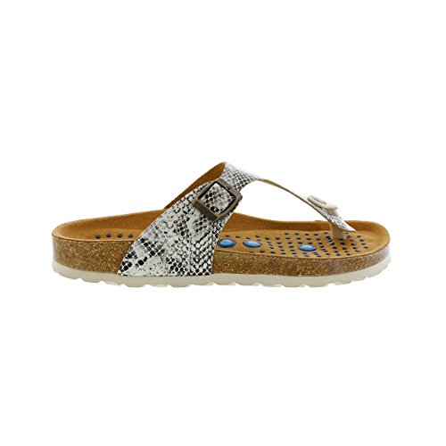 Binding : Apparel Product Description The?Geneve is an iconic thong sandal with an adjustable strap. Featured in Soft Nappa Leather with Snake Print. SPECIAL FEATURE: SIETELUNASTM Comfort Footbed Using the art of reflexology and magnetic therapy. This footbed targets reflexology points on the feet to improve circulation. Our patented molded footbeds contain seven gel nodules that are strategically placed to stimulate pressure points and increase blood flow. The improved foot circulation helps relieve muscle pain and soreness in fatigued feet and tired legs. The contoured cork insoles support the arch, wick away moisture, and contain 100 subtle gel nodes that provide a constant massage while walking. UPPER MATERIAL: Soft Nappa leather backed with suede lining feels soft to the skin and flexes with ease. INSOLE: PREMIUM GRADE MICRO-FIBER LINING: The flexible Micro-Fiber lining, which is gentle on the skin, nestles up softly against your foot and adjusts to its contour. The open-pored and thus very breathable surface makes for a comfortable foot climate, even during more strenuous physical activity. FOOTBED MATERIAL: 100% NATURAL CORK: Cork is a sustainable material extracted from the bark layer of the cork oak. This natural product is insulating and offers very good cushioning. OUTSOLE: EVA (ethylene vinyl acetate) is a high-quality, very light, elastic material with extremely good cushioning. As a result, it smooths out slight irregularities in the floor and ensures that every step is softly cushioned. 0