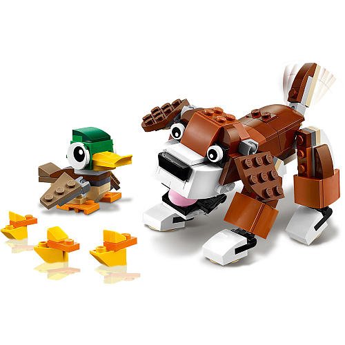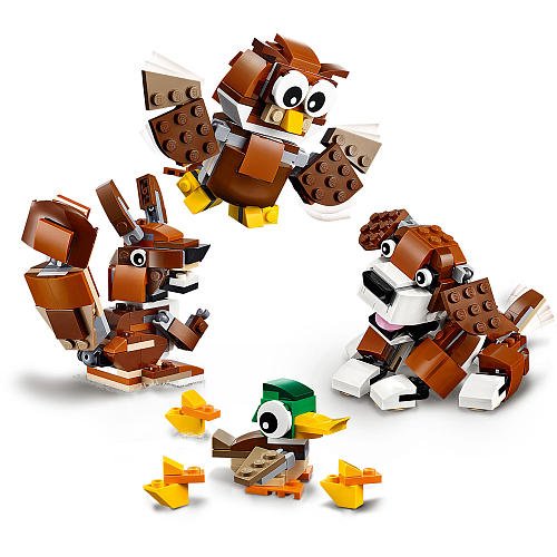 -. Binding : Toy -. Brand : L.E.G.O -. Color : Multicolor -. EAN : 5691702287667 -. Feature : A dog, duck and 3 ducklings. Dog features posable legs and ears, an opening mouth and a brown, dark-orange, white and black color scheme. / Ducklings come with a yellow and orange color scheme. Have fun creating and caring for the cute Park Animals. / 3-in-1 model - rebuilds into a Squirrel or an Owl. -. IsAdultProduct : 0 -. ItemPartNumber : 6135627 -. Label : LE GO -. Manufacturer : LE GO -. MPN : 6135627 -. PartNumber : 6135627 -. ProductGroup : Toy -. ProductTypeName : TOYS_AND_GAMES -. Publisher : LE GO -. Size : 10.3 x 5.5 x 1.8 -. Studio : LE GO -. Title : Building Park Animals Stacking Block Set (31044)