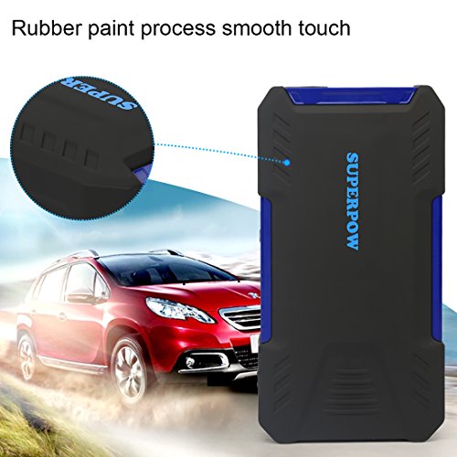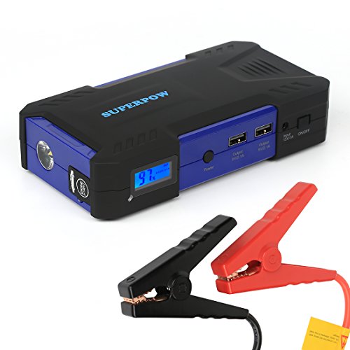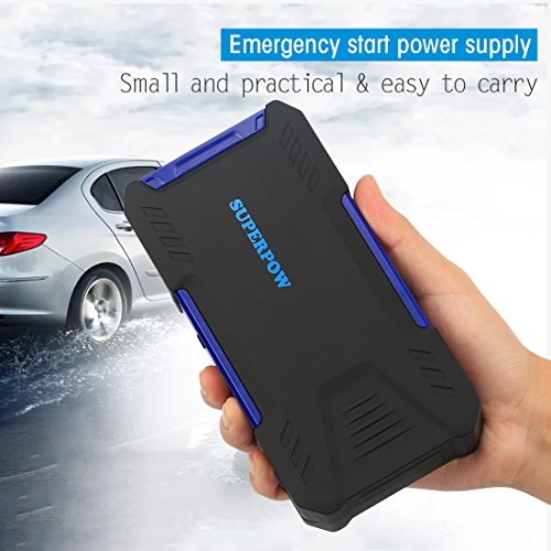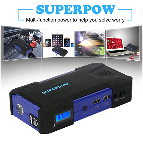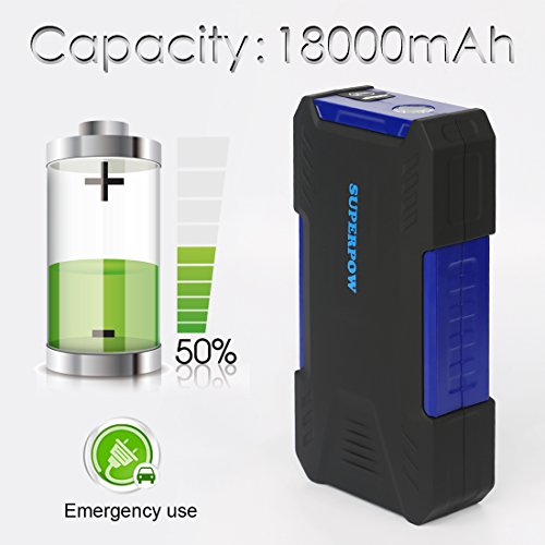 - [Super big capacity] With 18000mAh Power bank, Superpow jump starter will jump start your vehicle up to 30 times per charge with an amazing 800Amps Peak current: that’s enough power to jump start your car, motorcycle, yacht, snowmobile, RV, tractor or any other vehicles up to 6.5L Gas or 5.2L Diesel engine and other mobile devices like charge tyre inflator, car vacuum cleaner, phones, tablets, camera, kindle.