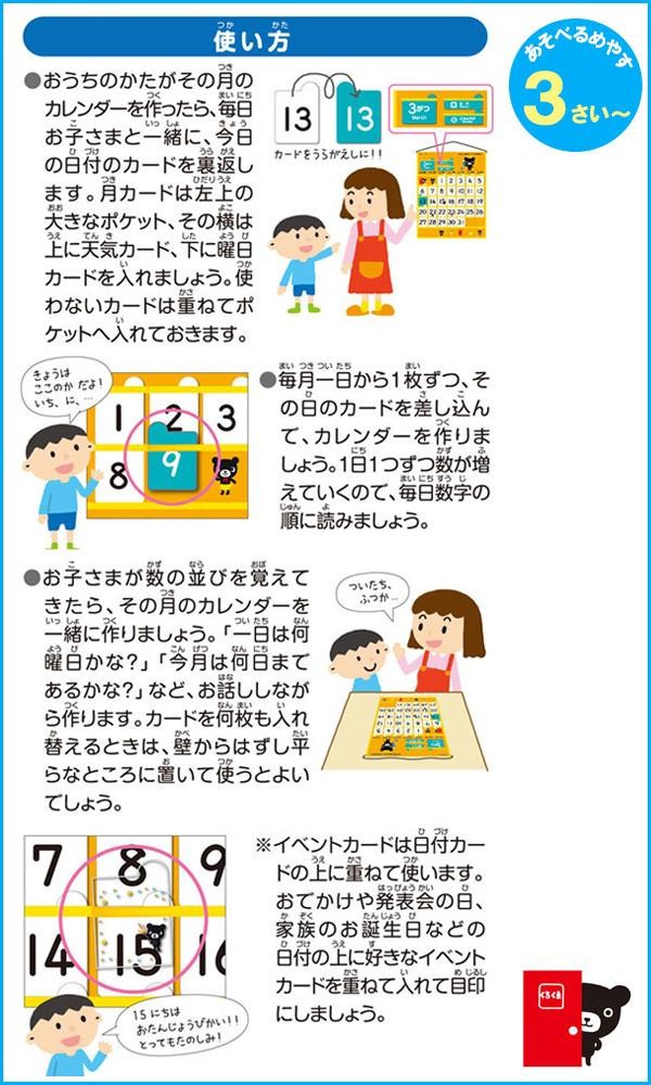 | 毎日くろくまくんと一緒に楽しく数に親しみましょう。今日の日付をうらがえしたり、1枚ずつふやしていったり。おうちのかたと次の月のカレンダー作りも楽しめます。イベントカードがついているので、「おでかけの日」や「おたんじょう日」など予定にあわせて、自分だけのオリジナルカレンダーをつくりましょう。 |