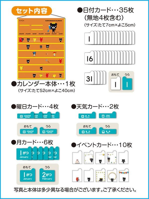 | セット内容 | カレンダー本体×1枚、日付カード×35枚(無地4枚含む)、曜日カード×4枚、月カード×6枚、天気カード×2枚、イベントカード×10枚 |