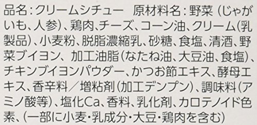 原材料:野菜(じゃがいも、人参)、鶏肉、チーズ、コーン油、クリーム(乳製品)、小麦粉、脱脂濃縮乳、砂糖、食塩、清酒、野菜ブイヨン、加工油脂(なたね油、大豆油、食塩)、チキンブイヨンパウダー、かつお節エキス、酵母エキス、香辛料/増粘剤(加工デンプン)、調味料(アミノ酸等)、塩化Ca、香料、乳化剤、カロテノイド色素、(一部に小麦・乳成分・大豆・鶏肉を含む)