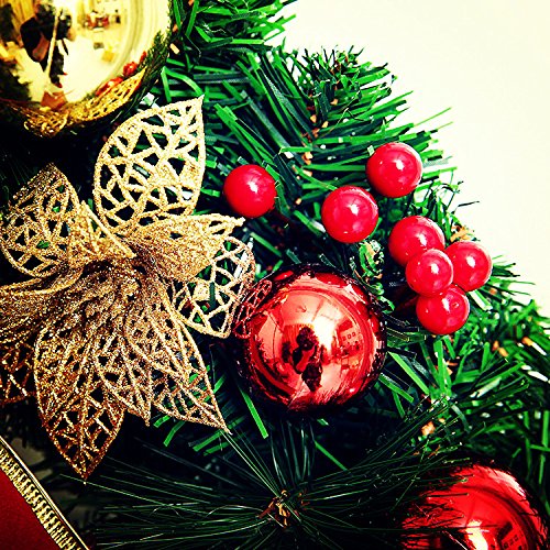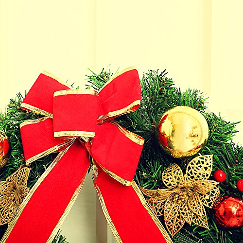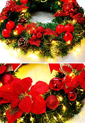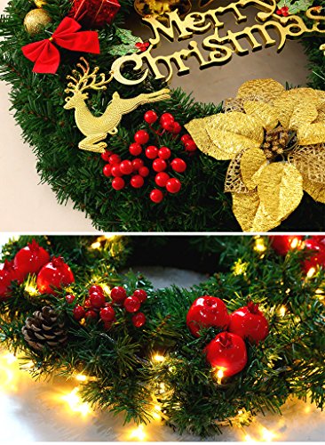 - 🎁CLASSIC DESIGN: The Christmas wreath is mainly made from high quality and waterproof PVC and trimmed with pine tips, red berries, holly leaves, bow tie, and bells. The most traditional and classic design of Christmas garland, suitable size makes the wreath more lovely and beautiful for Christmas decoration