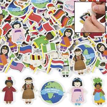 - 500 assorted shapes featuring flags, costumes and globe stickers.