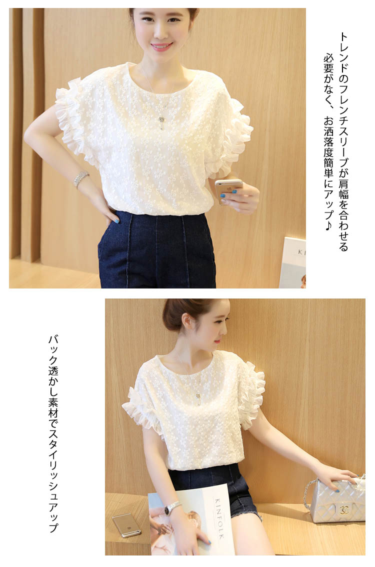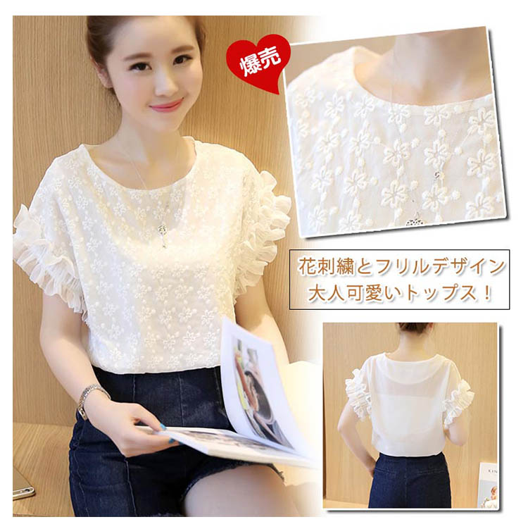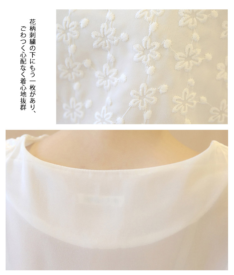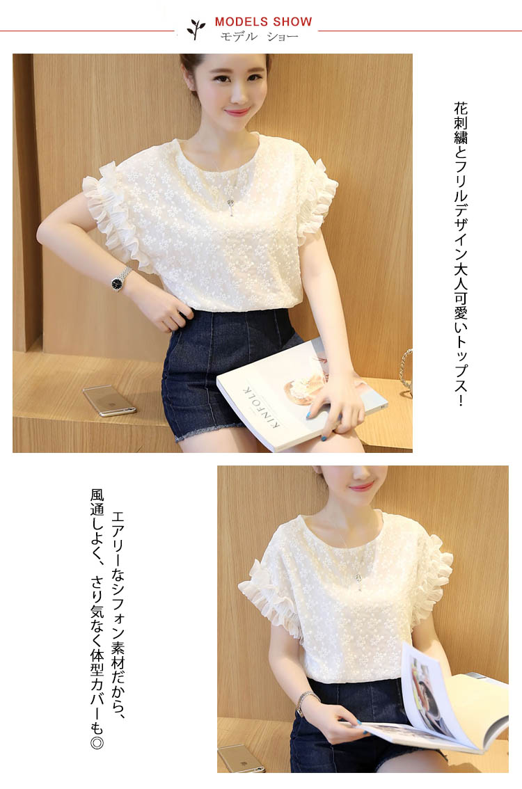 | 花刺繍とフリルデザイン大人可愛いトップス!エアリーなシフォン素材だから、風通しよく、さり気なく体型カバーも◎トレンドのフレンチスリーブが肩幅を合わせる必要がなく、お洒落度簡単にアップ♪バック透かし素材でスタイリッシュアップパンツスタイルもスカートスタイルにも合わせやすく、コーディネート幅広がります。一枚あるととっても便利な一押しアイテムです。 | |