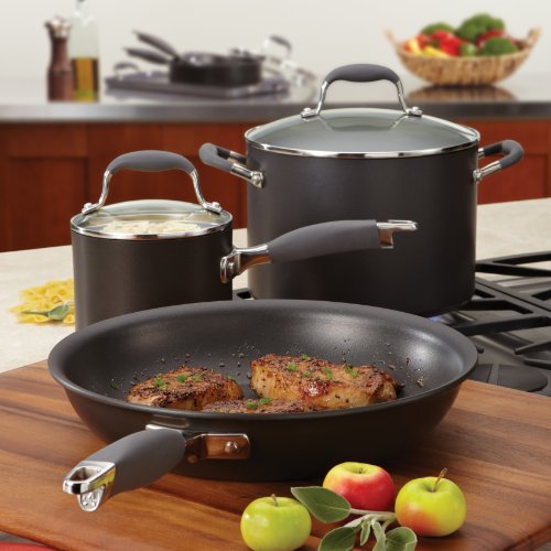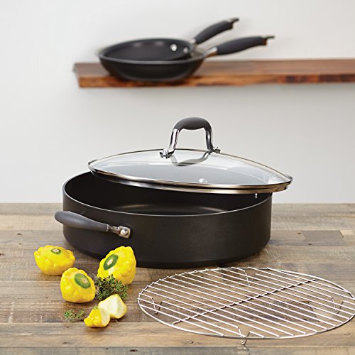 Slow-cooking methods like braising, stewing and roasting deliver the intense, bold flavors that serious cooks crave. This Anolon Advanced Hard-Anodized Nonstick 5-1/2-Quart Covered Braiser with Rack is ideal for professional-quality dishes that need time on the stovetop, in the oven or both. The heavy-duty hard-anodized aluminum construction provides fast, even heating and outstanding durability. Long-lasting, restaurant-quality DuPont Autograph 2 nonstick is metal utensil safe, easy to clean and provides superior food release and the removable rack keeps fresh asparagus or pork tenderloin elevated while roasting, away from excess fats and oils. Without the rack, this pan is ideal for stewing chicken in wine or braising artichokes in olive oil and lemon juice. The sturdy Anolon SureGrip stainless steel handles are rubberized for a comfortable, confident hold. The shatter-resistant glass lid allows cooking to be monitored while sealing in heat and moisture. This braiser is oven safe to 400 Degree F and makes an excellent companion piece for any Anolon Advanced cookware set. Cook like a seasoned pro and earn rave reviews time after time with this Anolon Advanced Hard-Anodized Nonstick 5-1/2-Quart Covered Braiser with Rack.Feature