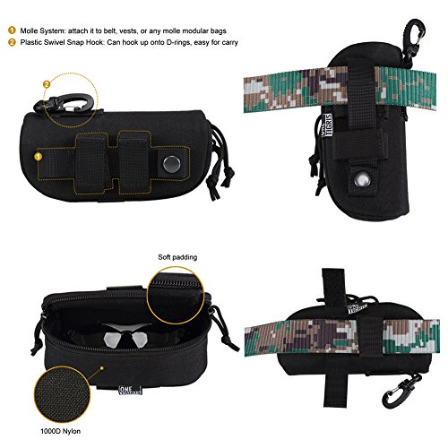 -. Binding : Eyewear -. Brand : OneTigris -. Department : mens -. Feature : 1000D Nylon Hard Clamshell Glasses Case: Durable material with hard shell inside provide sufficient protection to prevent glasses from damage by lighter pressure / Friendly Design: Two-way zipper for quick closure and access. Interior polypropylene plate with velvet lining, will not scratch your eyeglasses / Multiple Mounting Options to Carry Your Eyewear Case: It can be attached to belt, vests or any molle modular bags with vertical molle strap/horizontal hook & loop up on to D-rings with rear plastic clip / Hook and Loop Panel Provided for Attachment: Comes with "OneTigris" military patch for personalised your eyeglasses storage case / Measures 6.5"*3.1"*2.6"(16.5*8*6.5cm): Great for Eyeglasses/Sunglasses/Reading Glasses -. IsAutographed : 0 -. IsMemorabilia : 0 -. Label : OneTigris -. Manufacturer : OneTigris -. PackageQuantity : 1 -. ProductGroup : Sports -. ProductTypeName : SPORTING_GOODS -. Publisher : OneTigris -. Studio : OneTigris -. Title : OneTigris Eyeglasses Hard Case Tactical Molle Zipper Sunglasses Carrying Case 1000D Nylon with Clip