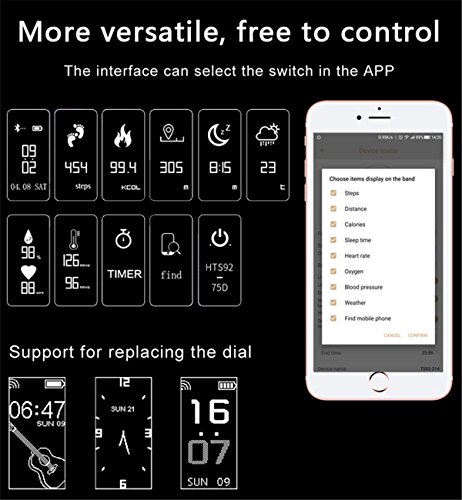 Multi-function Activity Bracelet:Heart Rate monitor, Sleep Monitor,Blood Pressure tracker, Pedometer,Mileage,Time display,Calories Counter,Sedentary alarm,Find Phone, Call Reminder,CallReject,Anti-lost, Call SNS SMS Alert, Camera Remote Control