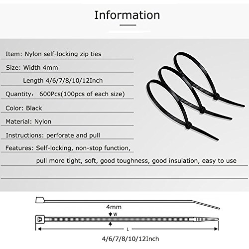 - Multipack of 600 premium 4/6/7/8/10/12" cable ties (100pcs of each size); Width 4mm/0.16inch.