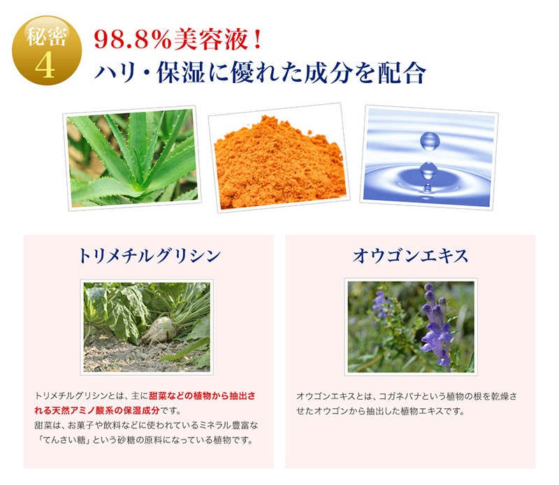| 成分 | 有効成分:グリチルリチン酸ジカリウム その他の成分:精製水、ジプロピレングリコール、濃グリセリン、トリメチルグリシン、ヒアルロン酸ナトリウム(2)、オウゴンエキス、アロエエキス(2)、フィトステロール、ヒドロキシエチルセルロース、水素添加大豆リン脂質、ポリオキシエチレン硬化ヒマシ油、BG、クエン酸ナトリウム、無水クエン酸、ユビデカレノン、エデト酸二ナトリウム、フェノキシエタノール、パラベン |