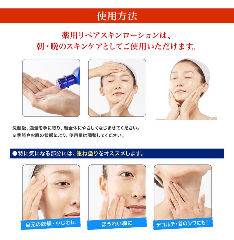 | ご使用方法 | 洗顔後、適量を手に取って顔全体によくなじませます。 乾燥や小ジワの気になるところには重ねづけするなど、使用量を調整ください。 |