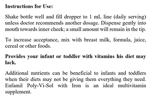 Enfamil Liquid Multivitamin Supplement Drops Poly-Vi-Sol With Iron. A No.1 Vitamin drops brand recommended by pediatricians. An ideal multivitamin supplement during your child's transition to solid foods, during growth spurts, or for the picky eater. Designed to help meet the nutritional needs of your growing infant or toddler. Has the amount of vitamin D recommended by the American Academy of Pediatrics for infants and toddlers who consume less than one quart of milk or formula per day. Helps support a developing immune system. Contains no artificial colors or flavors. One daily dose of Poly-Vi-Sol with iron has 8 vitamins and iron and is fruit flavored.Feature