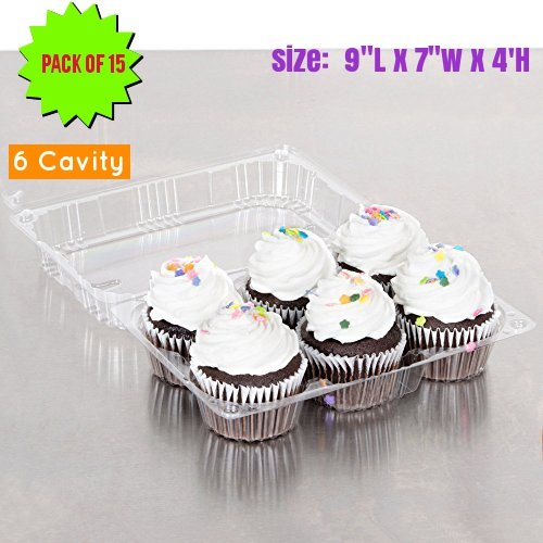 6 Cavity Cupcake Container Strong and Sturdy, BPA Free, Cupcake and Muffin Containers with Superior Hinged Lid,crystal Clear Plastic cupcake containers( pack of 15, 6-Compartment)