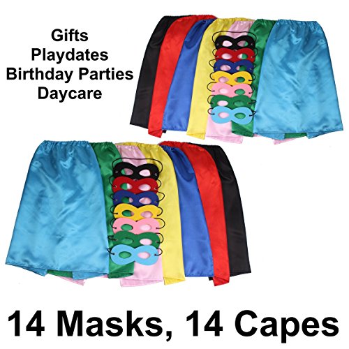 SUPERIOR QUALITY AND COMFORT ★ This 14 pack superhero set (14 capes and 14 masks) is made with premium, finest quality fabric for comfort, durability and functionality. This super hero dress up set has vibrant colors, silky to the touch and feels great on the skin. You kids will wear these costumes all day long! We have heard that some of our little customers would not take them off even at night!