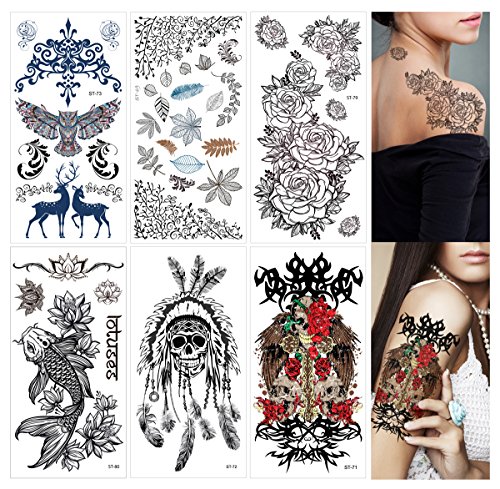 Supperb Mix Nature Floral Spirit Temporary Tattoos / 6-pack - Twin Roses, Leaves, Skull, Koi Fish, Lotus, Owl, Reindeer Temporary Tattoos