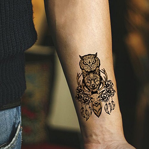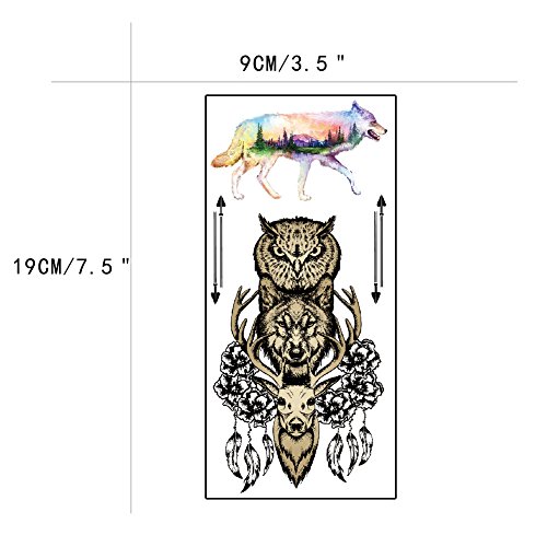 TAFLY Owl+Wolf+Deer Feather Design Temporary Tattoos Sexy Fake Body Tattoos Sticker 5 Sheets