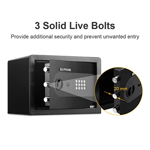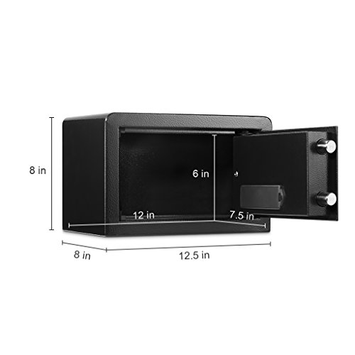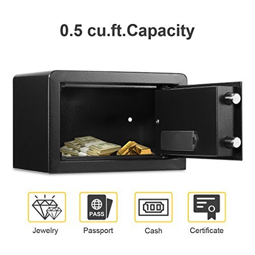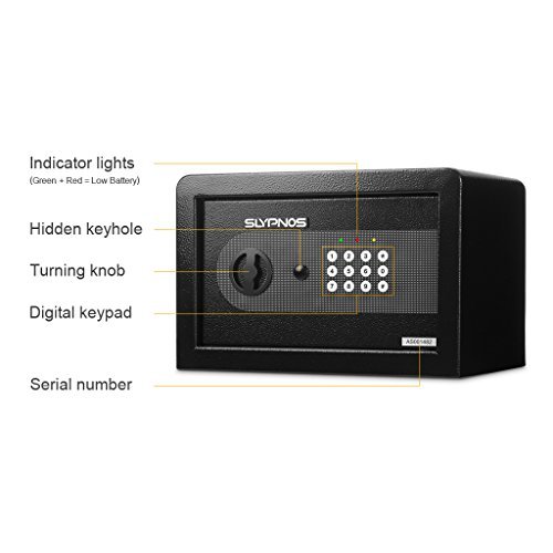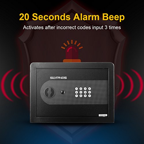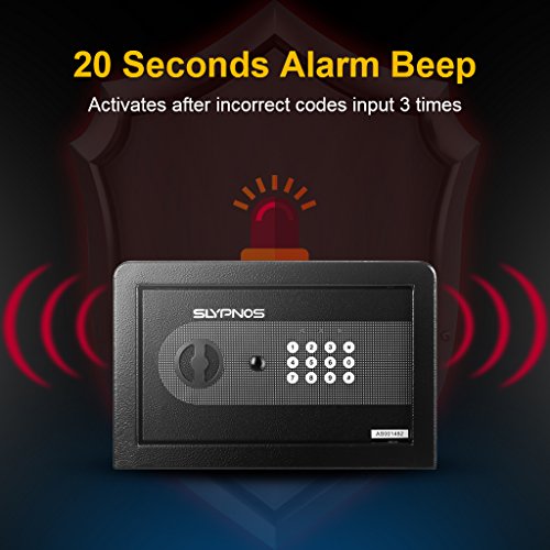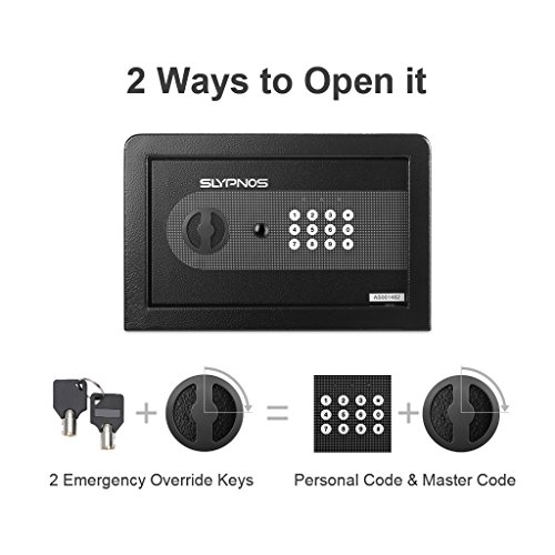 -. Feature : ★【ROBUST CONSTRUCTION WITH CARPETED FLOOR】: Built from solid steel, our powder-coated security safe offers red reliability and long-lasting strength; comes with a soft carpeted floor as an added layer of protection - to prevent jewelry, heirlooms, or other delicate items from scratches or damages. / ★【SAFE & STURDY】: Quality constructed by 2mm thick solid steel and 4mm thick front door with 2 enhanced 20mm thick live-door bolts and pry-resistant concealed hinges for more security, four bolts to mount the safe box into wall, shelf or floor. / ★【2 WAYS TO OPEN IT】: Our safe can be programmed with two sets of codes (Personal Code and Master Code) and you can give the personal code to a guest while maintaining the master code; 2 override keys for manual access. / ★【ELECTRONIC DIGITAL KEYPAD LOCK】: Digital keypad with water-resistant film and 3 indicator lights (green, red, yellow) makes it simple to operate and durable; a low battery warning. / ★【EASY TO INSTALL】: The home safe box has pre-drilled holes for wall or floor mounting. Includes mounting bolts, and 4 AA batteries to control the battery operated digital panel.
