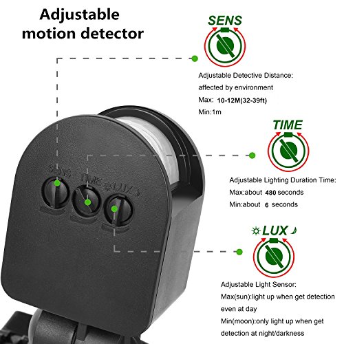 - Adjusta sensitivity & on-time/duration of light as your prefere: The motion sensor has sensitivity and on-time adjustable knobs for precision control and provides 120° - 180°motion-activated sensor detects movement with up to 32 ft. range and 6 -480 seconds downward perimeter protection, automatically turning the light on at working mode. It provides a high brightness lighting environment