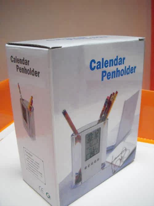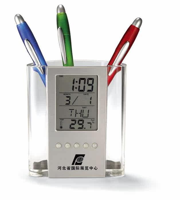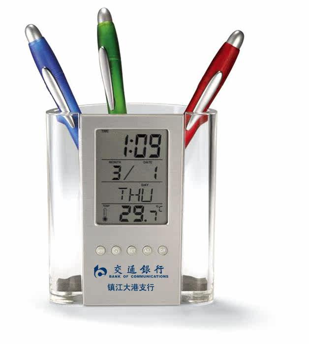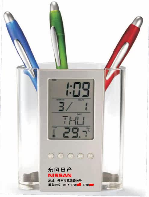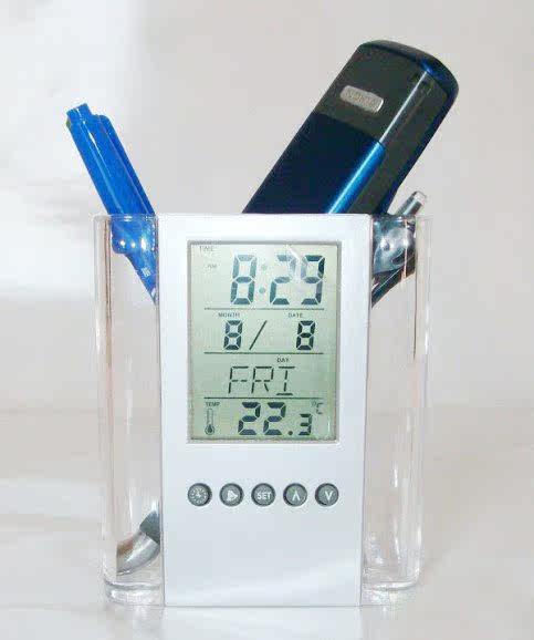 本品是一精美笔筒,作为礼物是首选之一,附带有多种功能,如大屏幕显示时间,日历,星期,温度等,有音乐闹钟和贪睡模式供选择。