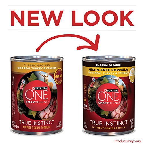 Feed your dog's natural instincts to choose nutrient-dense foods when you serve Purina ONE SmartBlend True Instinct Classic Natural Ground With Real Turkey & Venison adult wet dog food. Real poultry is the #1 ingredient in this canned dog food, along with real venison and other high-quality ingredients, including natural sources of glucosamine to help support healthy joints. The tender, meaty texture gives him something to happily sink his teeth into, and the grain-free formula lets you feel good about his food. We formulate this grain-free dog food without artificial colors, flavors or preservatives, and 0% fillers means that each high-quality ingredient serves a purpose. Give your canine companion lifelong smart nutrition along with the taste he craves when you fill his bowl with this delectable Purina ONE SmartBlend True Instinct recipe. He doesn't like waiting for his food, and you don't like making him wait. Get Purina ONE SmartBlend wet dog food quickly from Amazon.com.Feature