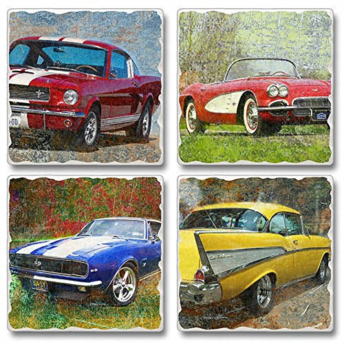 -. Binding : Kitchen -. Brand : Highland Graphics -. Color : multicolored -. EAN : 0608814044571 -. Feature : Assorted 4-coaster set - a different image/design on each one. Made in the U.S.A. / Each tumbled stone coaster is an approximate 3.625" square x 0.3" thick. / Tumbled edge adds elegance and charm. / Coasters are cork backed to protect your furniture and works well with either hot or cold beverages / Cleans easily with mild liquid detergent and water. Rinse & air dry. -. Label : Highland Graphics -. Manufacturer : Highland Graphics -. Model : 05-01294 -. MPN : 05-01294 -. PackageQuantity : 1 -. PartNumber : 05-01294 -. ProductGroup : Kitchen -. ProductTypeName : KITCHEN -. Publisher : Highland Graphics -. Studio : Highland Graphics -. Title : Classic Cars Square Assorted Tumbled Stone Coaster Set of 4, Highland Graphics -. UPC : 608814044571