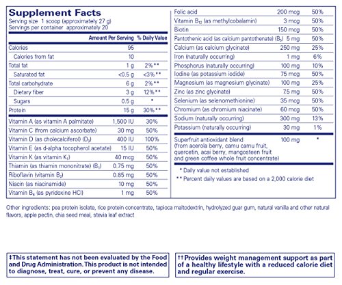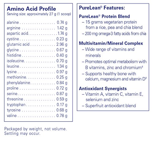 PureLean® Protein Blend: Features include: 15 g vegetarian protein from a unique blend of vegetarian rice, pea and chia proteins; 3 g fiber; 200 mg. omega-3 fatty acids from chia per serving; Superfruit antioxidant blend of acerola, camu camu, quercetin, açai, mangosteen and green coffee concentrate. Multivitamin/Mineral Complex: Features include: Wide range of vitamins and minerals; Promotes optimal metabolism with B vitamins, zinc and chromium; Supports healthy bone with calcium, magnesium and vitamin D; Antioxidant Synergists: Features include: Vitamin A, vitamin C, vitamin E, selenium and zinc; Superfruit antioxidant blend of acerola, camu camu, quercetin, açai, mangosteen and green coffee concentrate.Feature