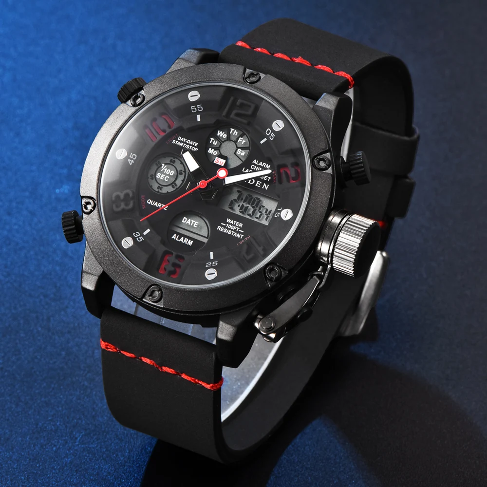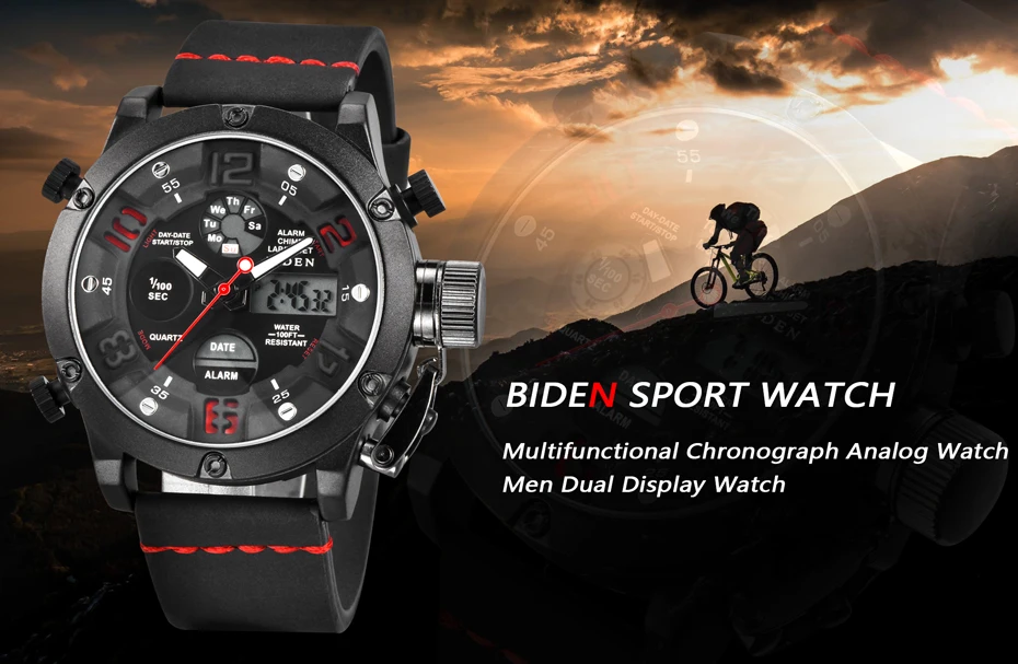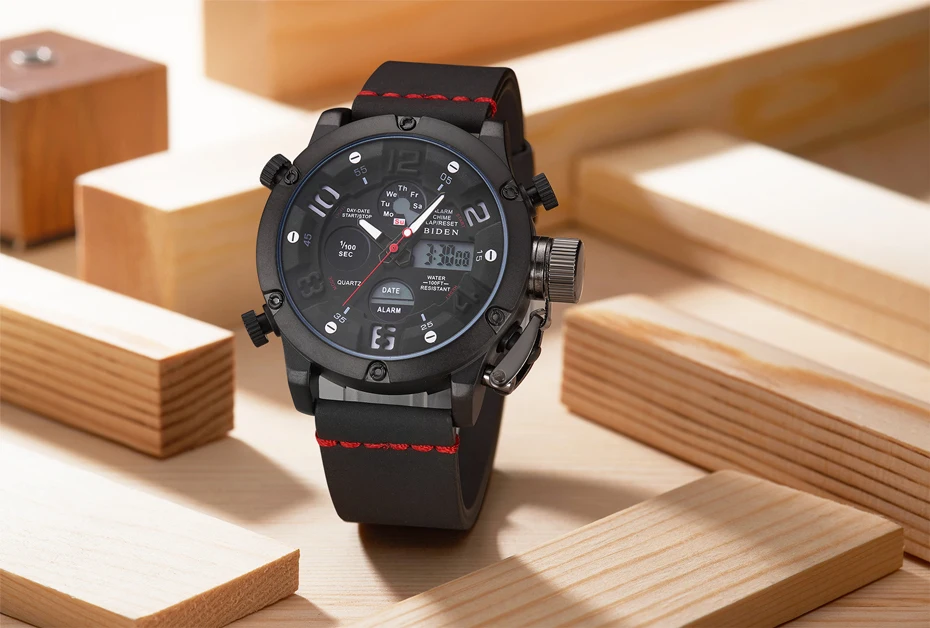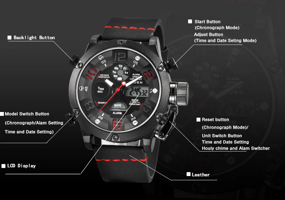 Feature:Water Resistant,LED display,Stop Watch,Auto Date,Complete Calendar,Week Display,Shock Resistant,Alarm,Chronograph