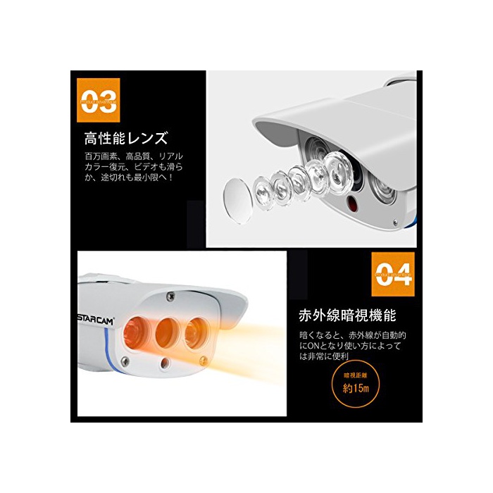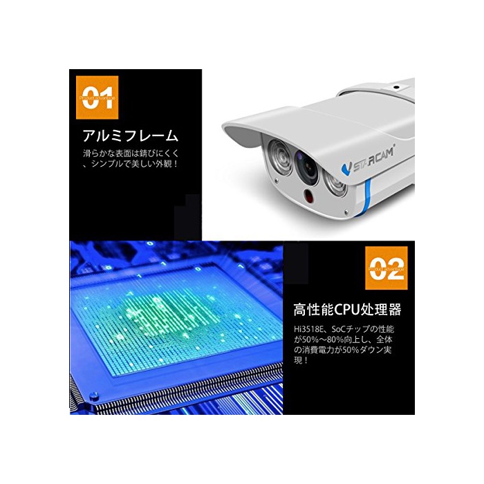 고화질:3.6MM IR-CUT기술을 채용한 카메라.해상 도HD 720p(1280×720)고, VGA(640×480)고, QVGA(320×240).카메라는 동시각에 다른 설비에 다른 비디오 스트림을 입력에 옵니다,유저로이다 갈 것인 것 시각 체험을 제공에 옵니다.암시,광각 촬영,디지탈 줌도 가능.카메라 본체에는 2개적 외등을 탑재하고 있고 하고, 야간등 카메라 주변《가》어두워지면,자동적으로 적외선을 쬐고, 약15미터까지 어두운 상태에서도 흑백에 촬영 하는 것 를 할 수 있습니다.