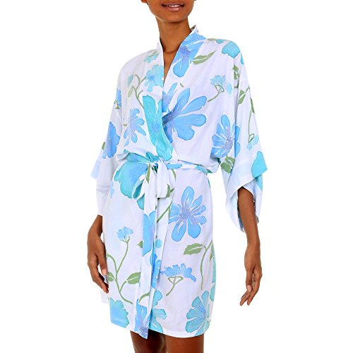 About this item: Blue hibiscus flowers, painted by hand, cover this short white robe. By Arthur Karvan, it features 3/4 length sleeves, and wraps and ties with a belt. Because the fabric is painted by hand, motifs and color distribution can vary slightly. Robe :38.0" L x 48.0" W x 22.75" Sleeve (center neck to cuff) Belt :79.0" L x 1.6" W - Lay flat to dry