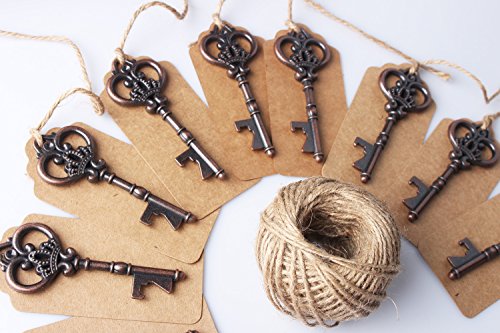 -. Feature : All the things you need - The package comes with 40 skeleton keys,40 tags, 1 rool twine. / Unique Antique Look - Rich vintage look with deep tone bronze color finishing.Suitable for rustic/vintage wedding. / Wedding Favors and Wedding Decoration - The dark copper tones on the key, the pastel brown card and twine accentuate your wedding décor with a vintage or rustic touch. / More interactivity - With escort card tags,you can write guest name,message or table numbers on them.Engage your guests, as they look around for their personalized tag, or get seat / Perfect Gift Choice - These keys make stylish bottle openers. Keep them in your kitchen or bar, or hook them onto your key ring. Your guests would remember your wedding or party for a long time!