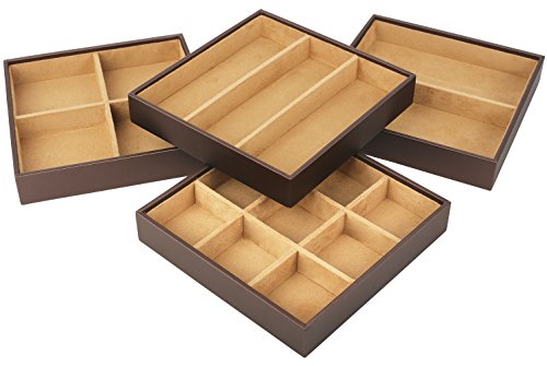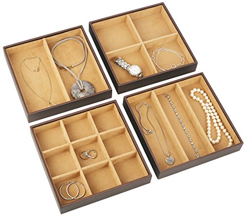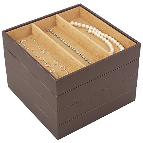 Product Description The perfect space saving jewelry organizer for all your jewelry and accessories. These Stacking Jewelry Organizer Trays is the perfect choice because it gives you so many options for holding all different types and sizes jewelry including the 9 compartment tray which makes a great earring organizer tray - the options are limitless. Easily contain daily essentials in the 4 trays. Dividers make it convenient to store a variety of items. Having company? No problem, store this trays in a drawer or closet for a clean organized room. Every member of the house will want one to organize their jewelry items they use everyday. Accessories and watches? No problem! Bracelets charms pendants necklaces rings earrings? Organized with ease. Buy with confidence your satisfaction is guaranteed. 0