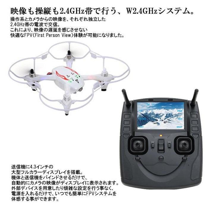 | 操作系とカメラからの映像を、それぞれ独立した2.4GHz帯の電波で交信。これにより、映像の遅延を感じさせない快適なFPV(First Person View)体験が可能になりました。送信機にフルカラーディスプレイを搭載。アプリも設定も不要。電源を入れれば、すぐにFPVシステムが起動します。送信機から動画・写真の撮影が可能。撮影画像を保存できるmicroSDカード付!! |