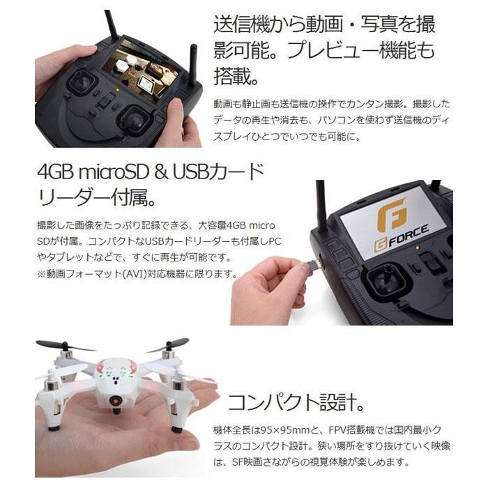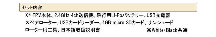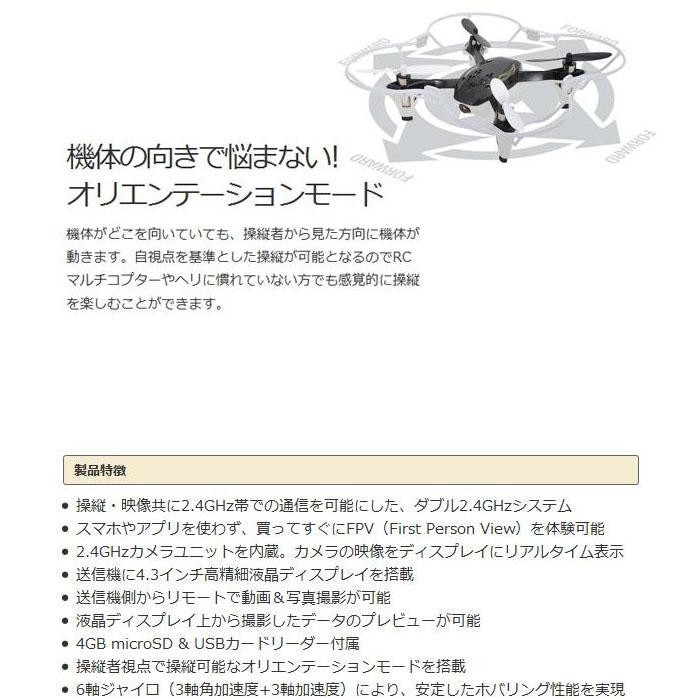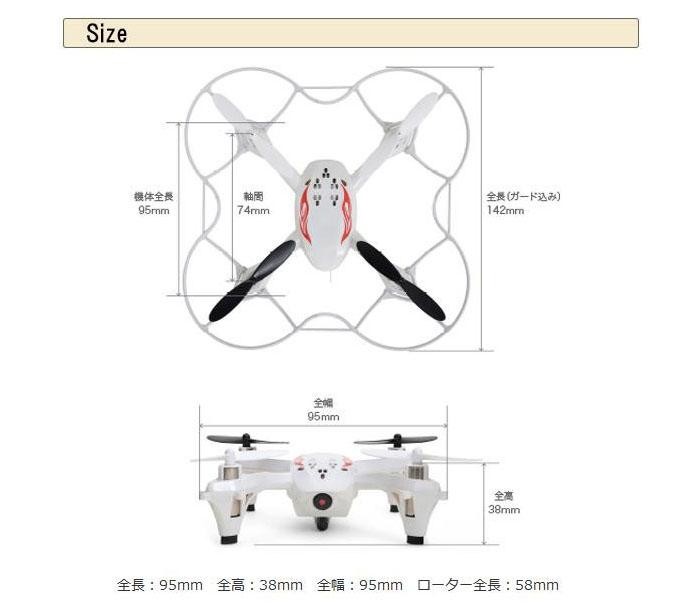 | 仕様 | 電源(送信機):単三電池×4本(別売) バッテリー:LiPo 3.7V 500mAh 充電時間:約60分(※バッテリーの状態によって異なります) フライト可能時間:約5~6分 電波到達範囲:最長およそ70m カメラユニット:動画:AVI形式/480×272 静止画:JPG形式/480×272 対象年齢:14歳以上 |