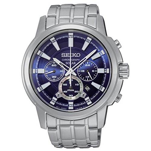 Seiko SSC387 Core Men's Silver Bracelet Band Blue Dial Watch. Display: Analog, Movement: Japanese Quartz, Crystal: Mineral. Case Material: Stainless steel, Band Color: Silver, Band Type: Bracelet, Dial Color: Pearl, Shape: Round. Powered by light energy, Hour, minute, and small second hands, Date calendar, 6 month power reserve once fully charged, Screw down caseback. LumiBrite hands, Chronograph measures up to 60 minutes in 1/5 second increments with split time measurement function, When the measurement reaches 60 minutes, the stopwatch automatically stops counting 24-hour indicator, 100M water resistant, Caliber V175. Directional, exciting and diverse, the Seiko Collection makes and breaks the fashion rules. Scouring the globe for inspiration, our Design Team is inspired by fashion's most covetable trends; providing you with a cutting edge wardrobe season upon season.Feature