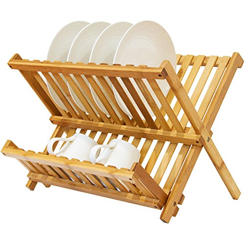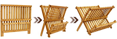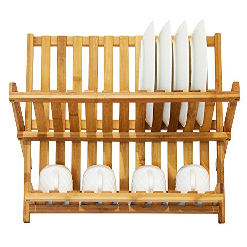 Bamboo Folding Dish Rack, Natural Bamboo [100% Organic] 2-Tier Collapsible Dish Drying Rack; Kitchen Utensil Holder; Wooden Dish Drainer for Dish/ Plate/ Bowl/ Cup/ Pot Lid