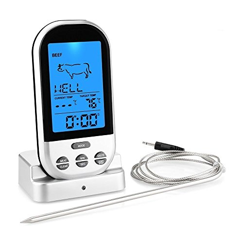 -. Feature : 温度範囲:0℃~250℃まで幅広い温度に対応できます、精度:±1°C。 / 調理モード:牛肉、鶏肉、ハンバーグ、豚肉、魚などの焼き方に応じた温度が設定されているので、とっても使いやすいです。8種類の食材と5種類の焼き方に対応できます。 / 無線リモコン:無線リモコンができますので、最大測定距離は100メートル以上。キッチンでお肉の状態をモニタリングの必要はありまぜん。 / プローブ :ステンレス鋼プローブは16.5cm、火傷の心配はいりません。1メートル以上のステンレスメッシュケーブルはバーベキューに便利。 / アラーム機能とタイマーモード:料理タイプ、温度とタイマーを表示されます。温度計はアラーム機能付き。タイマーはタイムアウトアラーム機能付き。お肉の種類と焼き加減も表示されます。お肉が設定温度に達する時、ブザーは警報音が鳴ります。