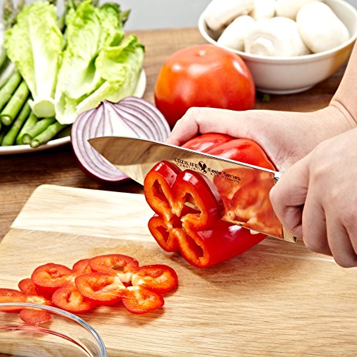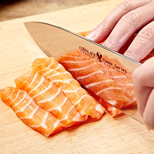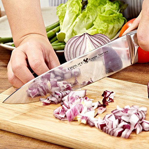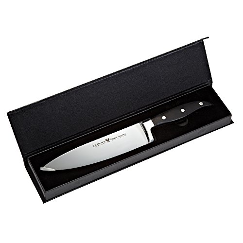 We don't want to talk about the obvious, the product stands for its fine craftsmanship all by itself. We want to tell you what is behind the scenes. The steel of this knife is German made, formula X50CrMoV15 in particular. The steel is commonly used by major German knife manufacturers. But with our unique forging process (increase the density and the carbon content of the blade) and triple-heat-treatment technique, we achieve the hardness of 57°±1° HRC rather than 55° for most of the German knives. As a result, the knife's sharpness retention is much better which means you don't have to grind it frequently and also it is not too hard that you can't grind it at all.