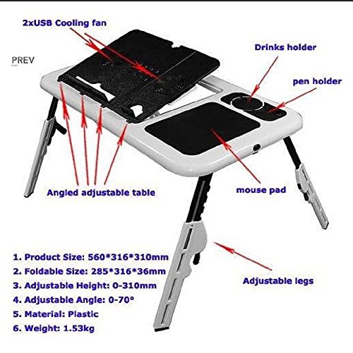 -. Binding : Kitchen -. Brand : FlyStone -. Feature : Sturdy and reliable. Excellent source to be used for any 15-Inch or under laptop. / Height and angle adjustment for maximum comfort and two powerful but silent USB powered laptop cooling fans. / RoHS compliant plastics with metal reinforcing, maximum load of 30 pounds. / Integrated mouse pad, cup platform, and pen holder. Easy for operation, set up in seconds . / COME WITH FLYSTONE® MICROFIBER CLEANING CLOTH. -. Label : FlyStone -. Manufacturer : FlyStone -. Model : E-Table Laptop Cooling Desk -. MPN : E-Table Laptop Cooling Desk -. PartNumber : E-Table Laptop Cooling Desk -. ProductGroup : CE -. ProductTypeName : HOME -. Publisher : FlyStone -. Studio : FlyStone -. Title : FlyStone® Portable Notebook Table Folding Laptop Buddy Desk E-Table Flexible Portable Laptop Table with Cooling Fans for Dell Inspiron i15R-1633sLV / ASUS VivoBook X202E-DH31T 11.6-Inch Touch Laptop / Toshiba Satellite C855-S5343 PSCBLU-025003 / Dell Inspiron i15R-1632sLV / HP Envy dv6-7218nr / Acer Aspire V3-571G-6407 / Apple MacBook Pro MD101LL/A 13.3-Inch Laptop