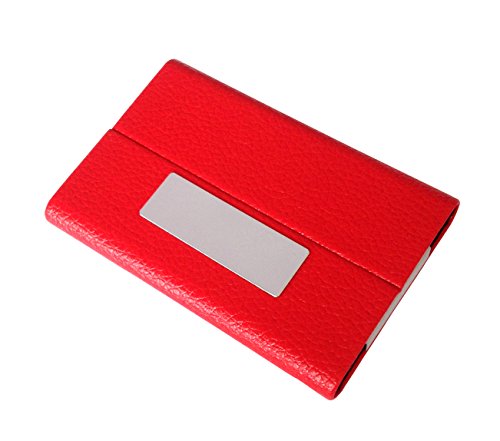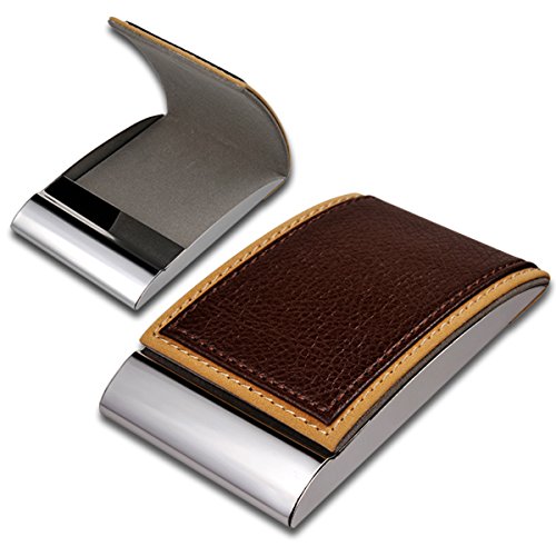 Keep your business name cards readily available to hand out in this sleek card case. The sophisticated design is perfect for creating an executive touch. The Stainless Steel/PU Leather name card case is thin enough to fit inside your blazer pocket or small purse and holds about 15 business cards. This metal card holder is easy to open and close with a secure magnetic closing. A great gift idea for both men and women. Your cards are kept clean, crisp & ready to impress! This is a great corporate gift, or business gifts to customers and friends. Dimensions are approximately 3.75" x 2.5" x .5" for the Navy, Red and Burgundy designs. The Black and Brown designs are approximately 4" x 2.5" x .5".
