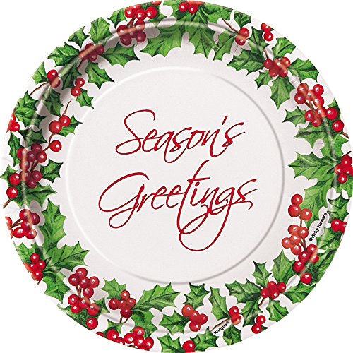 - Holly Garland Plates feature red and green sprigs of holly with a "Season's Greetings" message