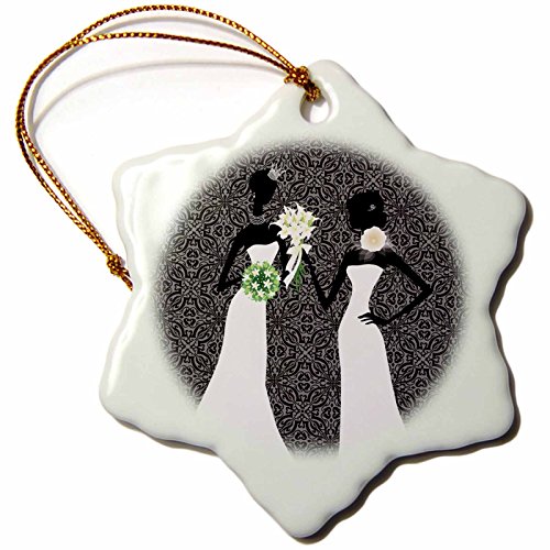3dRose orn_164713_1 Two Brides in Wedding Gowns with Black Damask Background Snowflake Ornament, Porcelain, 3-Inch