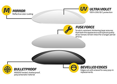 All of our lenses offer 100% UV protection, impact resistance that exceeds ANSI Z80.3 and EN 1836:2005 standards, multiple layers of the most intense and rugged hard coatings and hydrophobic coatings to keep your lenses clean and protected and, of course, a 100% money back satisfaction guarantee.