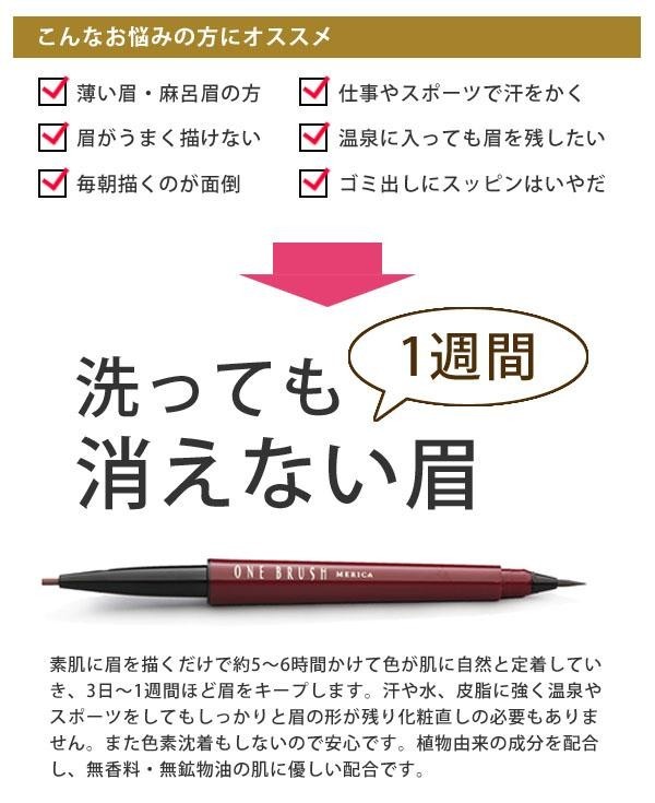 | 素肌に眉を描くだけで約5~6時間かけて色が肌に自然と定着していき、3日~1週間ほど眉をキープします。汗や水、皮脂に強く温泉やスポーツをしてもしっかりと眉の形が残り化粧直しの必要もありません。植物由来の成分を配合し、無香料・無鉱物油の肌に優しい配合です。グレーブラウンとブラウンの2色からお選びいただけます。 |
