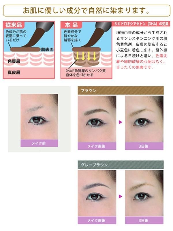 素肌に眉を描くだけで約5~6時間かけて色が肌に自然と定着していき、3日~1週間ほど眉をキープします。汗や水、皮脂に強く温泉やスポーツをしてもしっかりと眉の形が残り化粧直しの必要もありません。植物由来の成分を配合し、無香料・無鉱物油の肌に優しい配合です。グレーブラウンとブラウンの2色からお選びいただけます。 |