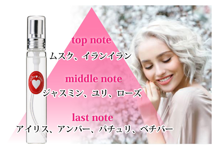 内容量 25ml 香り トップノート/ムスク、イランイラン ミドルノート/ジャスミン、ユリ、ローズ ラストノート/アイリス、アンバー、パチュリ、ベチバー