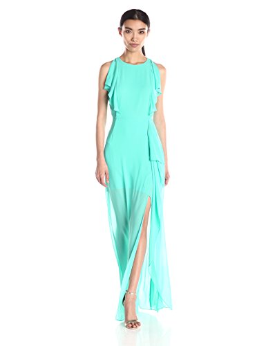 Product DescriptionStep onto the scene in a featherweight georgette gown with an alluring slit and diaphanous ruffles.0