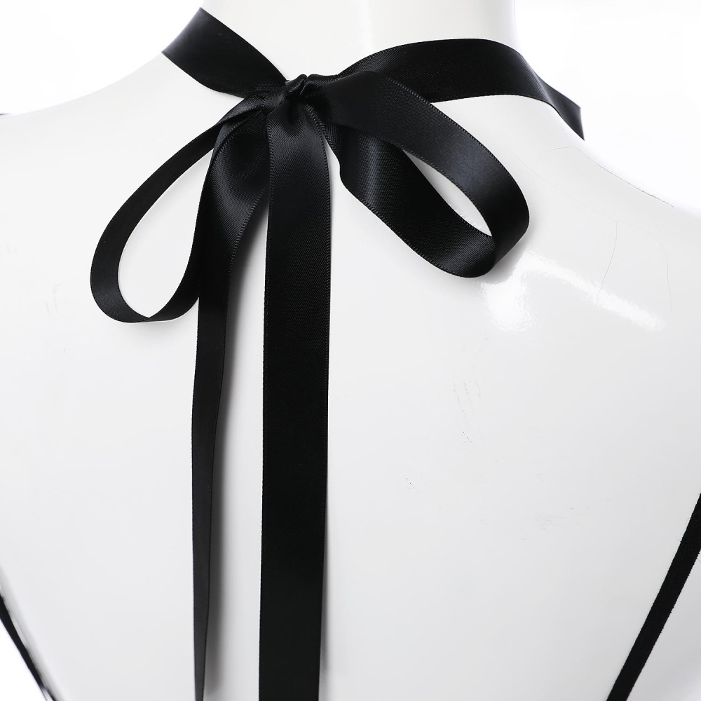 목부분의 레이스가 포인트이며, 리본으로 묶는 홀터넥스타일로 가슴라인을 부각시키며,스커트의 뒷중심 절개로 섹시함을 한층 더 강조해줌.