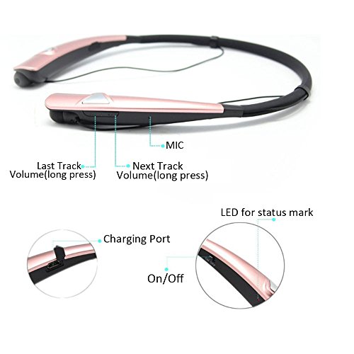 Specifications: Color: Black, Rose Gold Bluetooth:CSR4.0 Support:HSP, HFP, A2DP, AVRCP Frequency Range: 2.401-2.480GHz Frequency Response: 20HZ-20KHZ Working Distance:≤33ft Charging Time:≤ 2 hours Talk Time:≥10 hours Music Time:≥8 hours Standby Time:≥375 hours Item Weight: 1.0 ounces Dimensions: 6.51 x 6.11 x 1.11 inch (LWH)