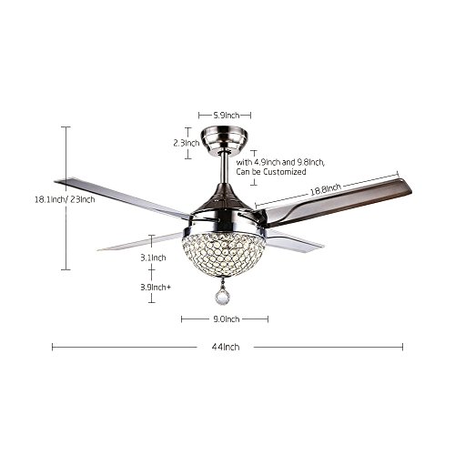 Size:44 Inch,Exterior Material:Metal Top Cover,Stainless Steel Blades and Crystal Lampshade. Crafts :Plating and Polishing.Sturdy and Durable,Anti-corrosion. Down Rod Length:4.92 Inch and 9.84 inch.